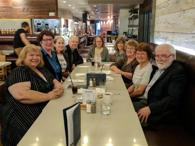 Clockwise from L to R: Toni L.P. Kelner, Dana Cameron, G.M. Malliet, Bill Crider, Janet Hutchings, Angela Crider Neary, Charlaine Harris, Paula Woldan, Brendan DuBois. Photo courtesy of Dana Cameron.