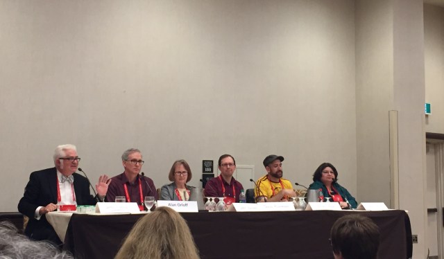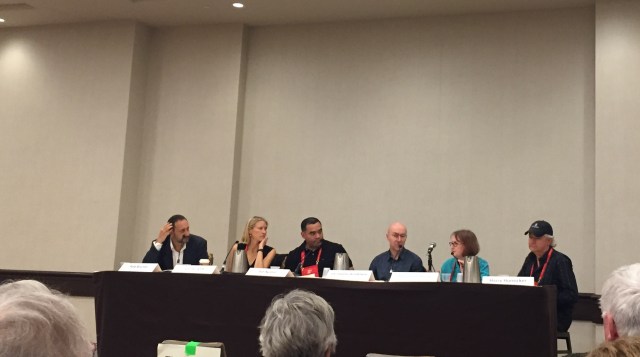 “5-Minute Misdemeanors: Constructing the Short Story” panel. L to R: James Lincoln Warren (moderator), Alan Orloff, Janet Hutchings, Travis Richardson, Angel Luis Colón, Barb Goffman. Photo courtesy of Jackie Sherbow.