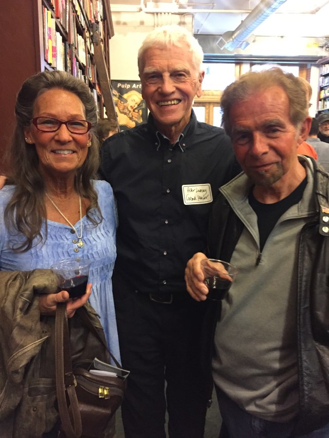 L to R: Eve Allyn, Peter Lovesey, Doug Allyn at the Mysterious Bookshop. Photo by Jackie Sherbow.