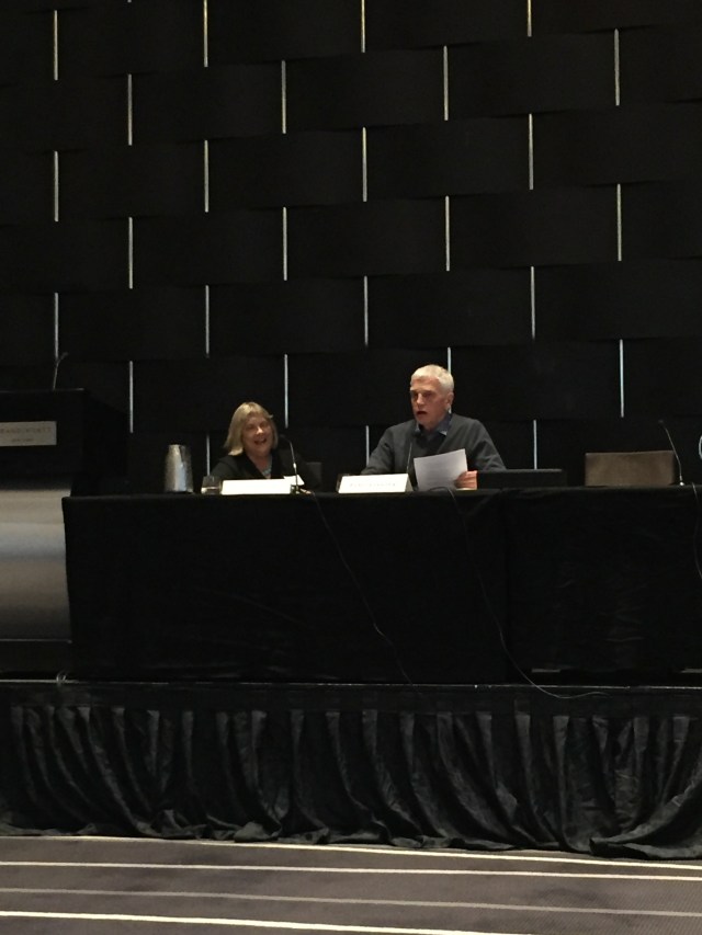 Oline Cogdill with Peter Lovesey during his Grand Master interview at the MWA Edgar Awards Symposium.