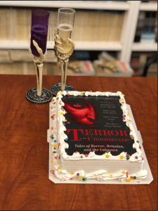 We ran the idea by Janet as well as Linda Landrigan, Sheila Williams, and Trevor Quachri (the editors of AHMM, Asimov’s, and Analog) and Chris Begley, (Dell’s VP of Editorial). Everyone was willing to hop aboard our spooky train. Then we began the fun part, selecting stories for the book. We tried to choose a group of tales with a variety of styles and viewpoints from the last ten years of the magazines. Many of our contributing authors are fans of the horror genre—and a number do write it in it often—but some were pleased to see their story in a new way, or to have a story they took a chance on see a new publication. Meanwhile, we approached the people who made this anthology possible: our subrights and digital-marketing team. Carol Demont, Joy Brienza, and Abby Browning have our gratitude, as does the typesetting team, headed by Sue Lemke and Jayne Keiser. It was my and Emily’s first time putting together a digital anthology, and they walked us through the process and handled the enormous amount of work involved with preparing a book for different digital outlets. Of course, I should also thank my coeditor Emily, for all her work and skill. Dell’s editorial assistant Deanna McLafferty helped us with proofreading and administrative tasks, and Joy designed the fantastic cover. Darcy Bearman helped us with social media and came up with the idea for our digital launch party, which took place last week. We are so lucky to have had a group of enthusiastic and generous authors who gave us their time and participation; you can see some of the highlights here.