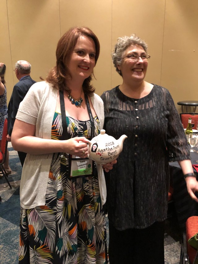 Tara Laskowski and Leslie Budewitz accept their Agatha Awards for Best Short Story
