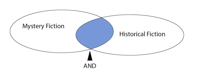 The computer finds the set that matches your first criteria (in this case that the form/genre headings include “mystery fiction”). Then the computer finds the set that matches your second criteria, for instance that the form/genre headings include ‘historical fiction.” The computer looks at your search to figure out what you want done with the two sets, and if you have used the Boolean AND operator, it finds where those sets overlap. In other words, it creates a search result set of records that have BOTH “mystery fiction” AND “historical fiction” in the form/genre field.