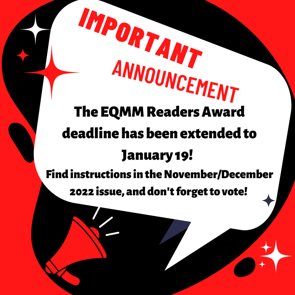 The EQMM Readers Award ballot deadline has been extended to January 19, 2023! Find more information in the November/December 2022 issue. Make your opinion about the year’s issues and next year’s heard!