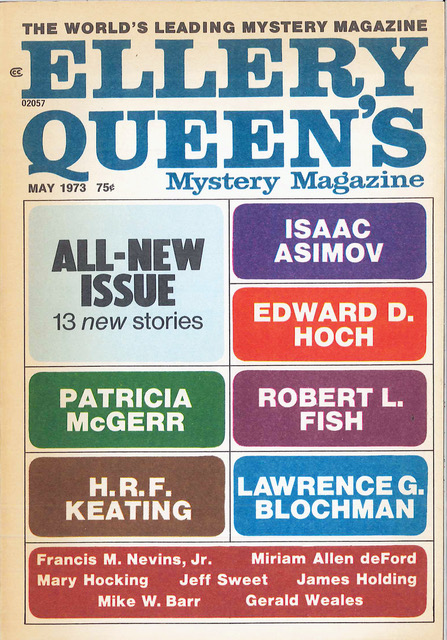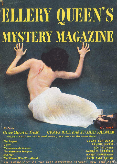 Dannay’s experiment was, of course, a success: The first issue sold over 90,000 copies—which would, today, be an absolutely astounding feat for a genre-fiction magazine. Nevertheless, competition on the newsstand was fierce. You had to stand out in some way to get the attention of new readers and as the first point of contact with buyers was the cover image, a lot of attention had to be paid to art. In EQMM’s first years, the famous book designer George Salter served not only as art director but cover artist for many of the covers. Eventually, in order to remain competitive on the newsstands, EQMM had to resort to more lurid and sexually explicit covers than was typical of the Salter issues. By that time, though, the magazine had already converted a number of its newsstand readers to subscribers, and Dannay didn’t feel comfortable sending copies with nudity and sexual violence depicted on the cover into households where kids might pick them up. Thus began in interval in which only newsstand buyers could obtain issues with cover art. Subscribers got plain-type covers.