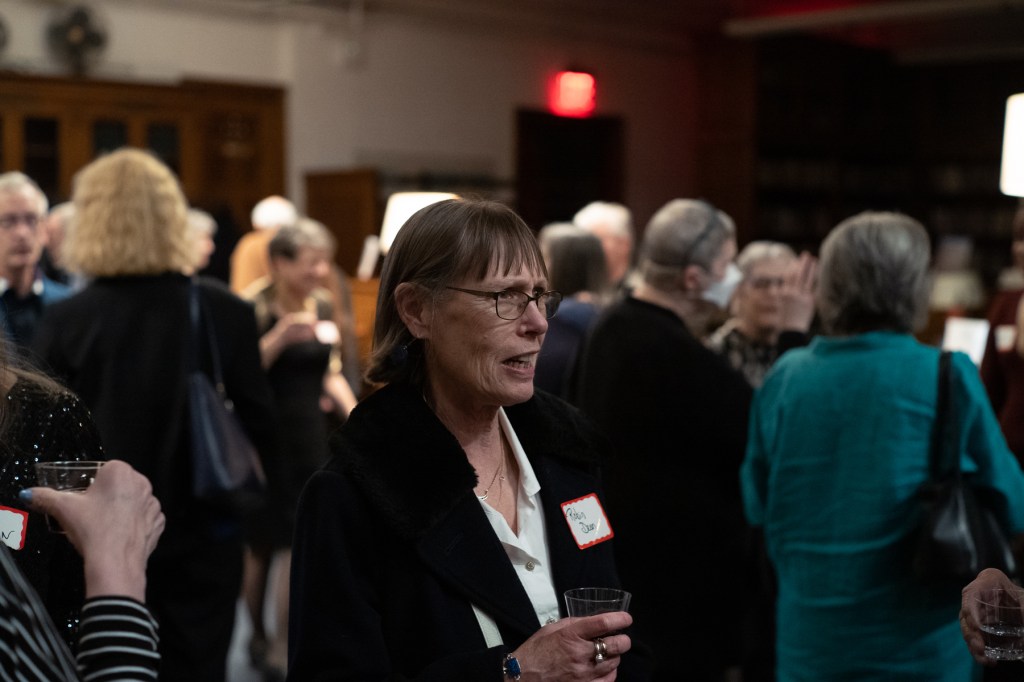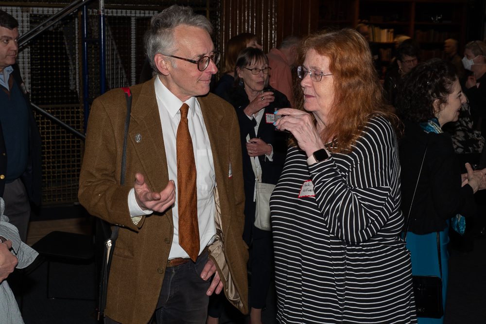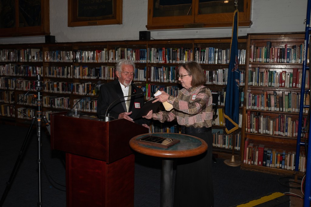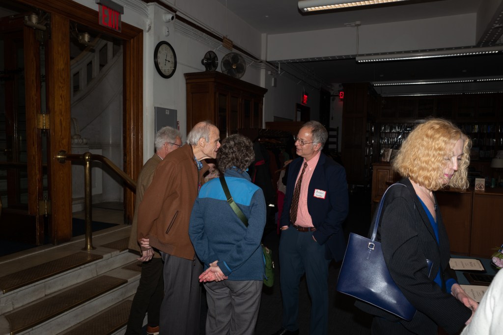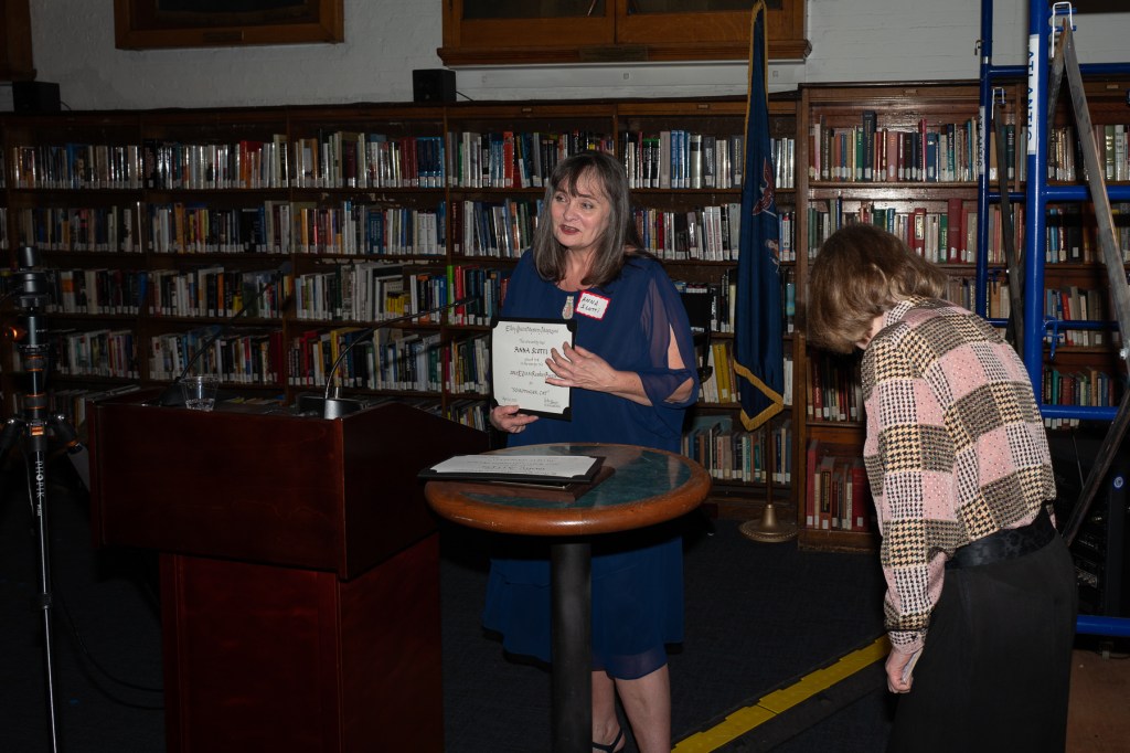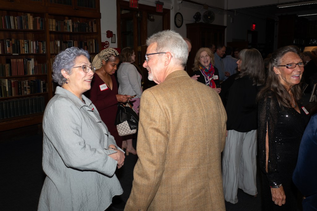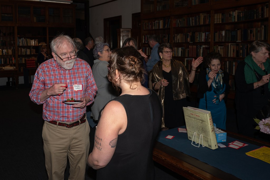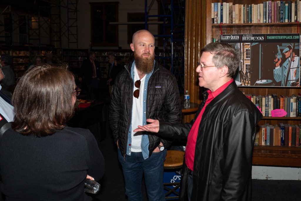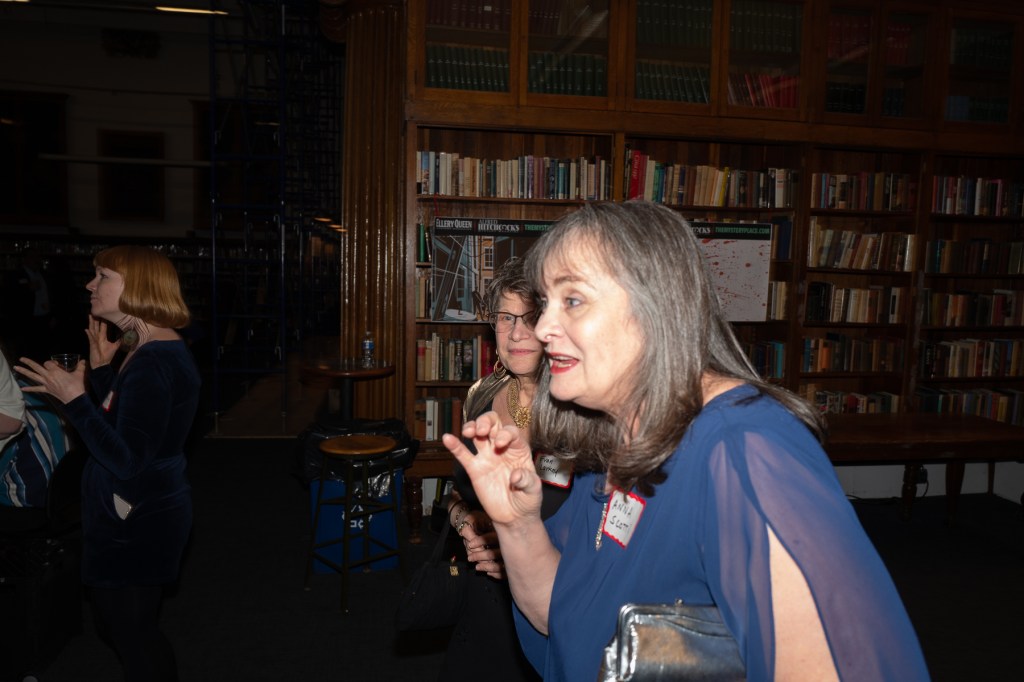 It’s my pleasure this week to herald the return of our photo gallery of events surrounding the Edgar Allan Poe Awards in New York City and the Malice Domestic convention in Bethesda, Maryland! The festivities all kicked off for the Dell Mystery Magazines with our pre-Edgars party, at which it’s been our custom for many years to present the EQMM Readers Awards. The Readers Awards presentation had to be done virtually in 2020 and 2021. In 2022, we held an in-person gathering, but it was a scaled-down celebration, with few guests attending from out of town and only two of the year’s four Readers Award winners present. As you’ll see from the photos below, last week’s party filled the house (which was, as in several previous years, the library of the General Society of Mechanics and Tradesmen, on 44th Street in Manhattan). Attendees included third-place Readers Award winner Anna Scotti, who flew in from California to receive her scroll for “Schrödinger, Cat” (EQMM March/April 2022); Doug Allyn, whom we hadn’t seen since our 2019 pre-Edgars party, who took second-place honors for “Blind Baseball” (EQMM May/June 2022); and W. Edward Blain, who captured readers’ votes with his pandemic-inspired story “The Secret Sharer” (EQMM July/August 2022), which took first place from a field of more than a hundred stories published in the magazine in 2022.