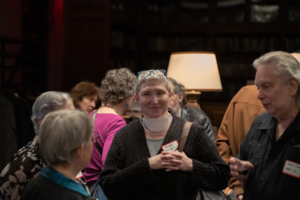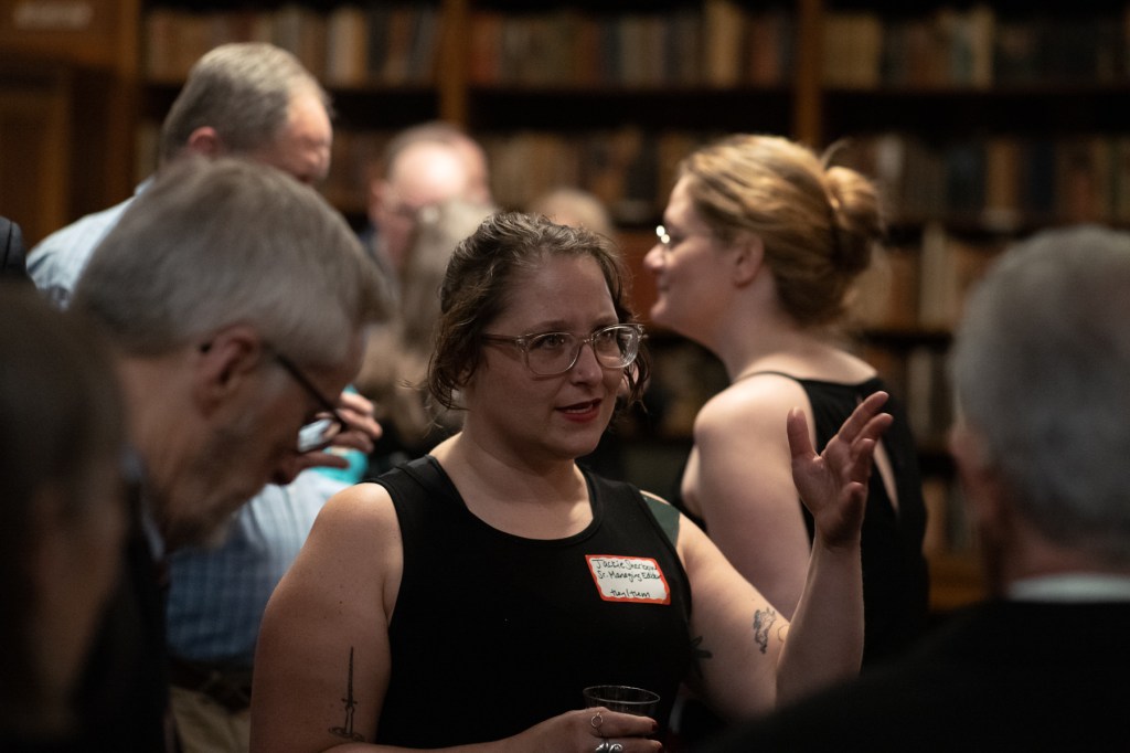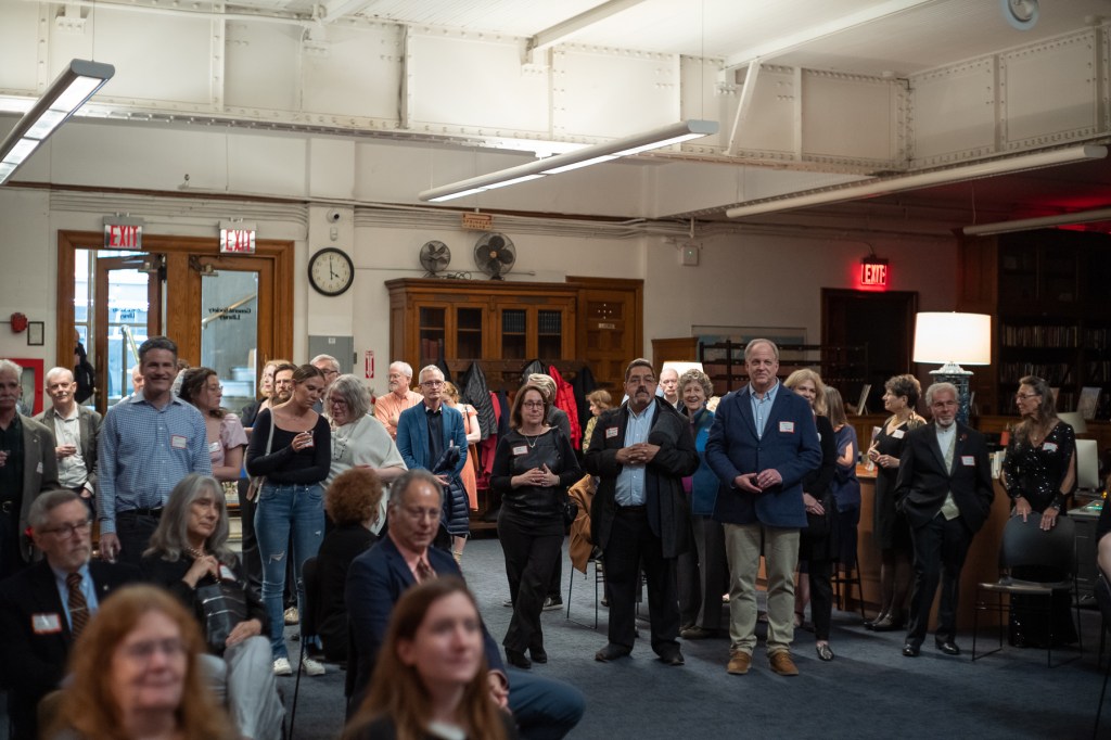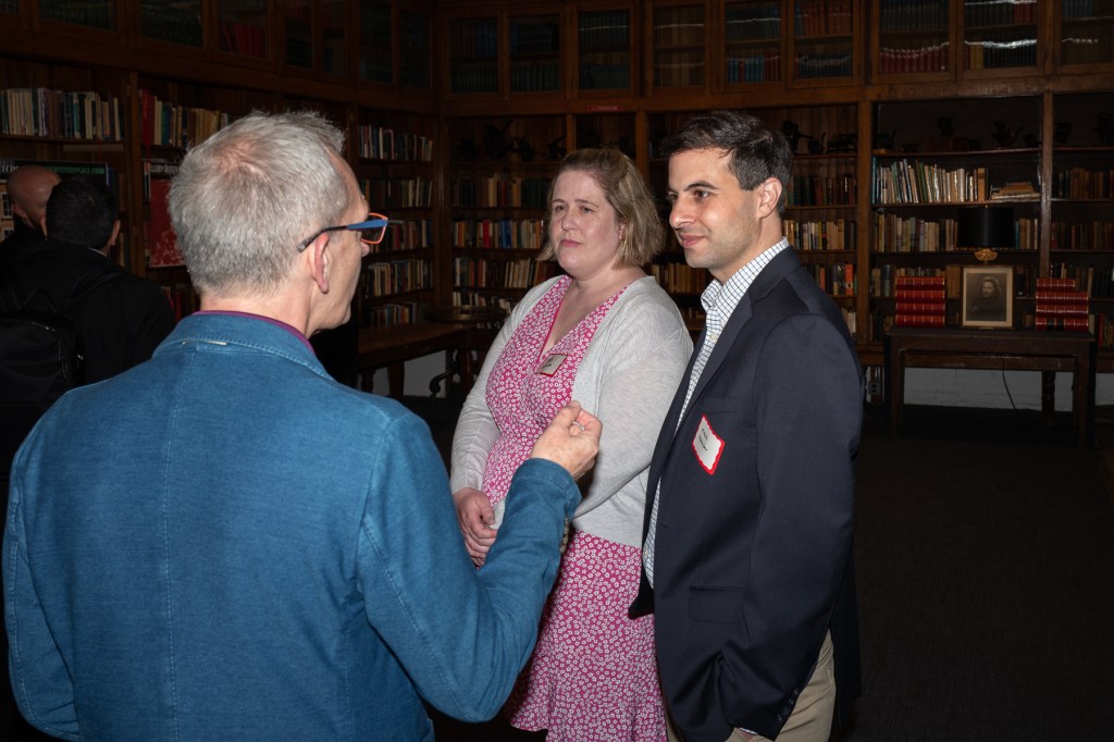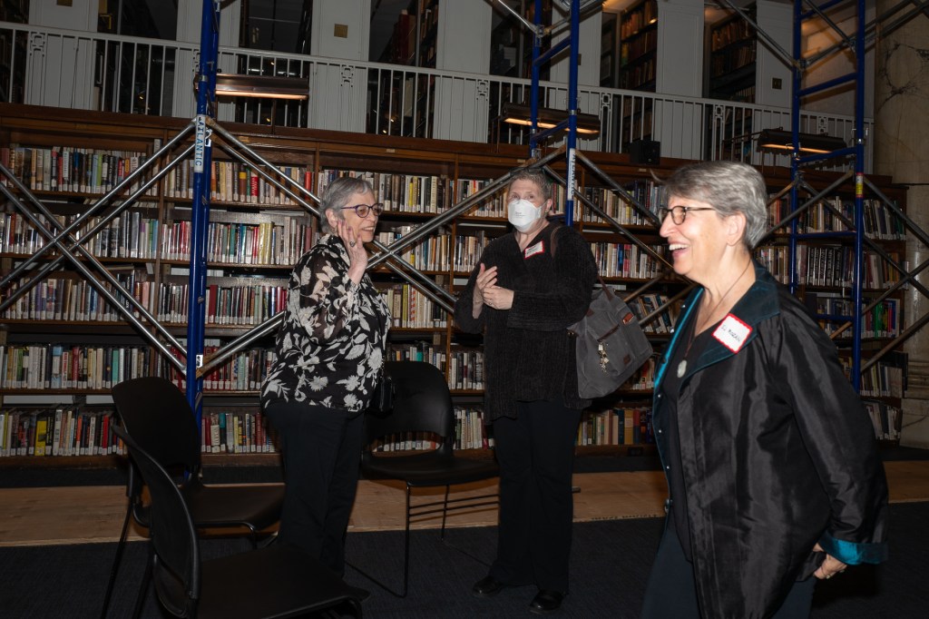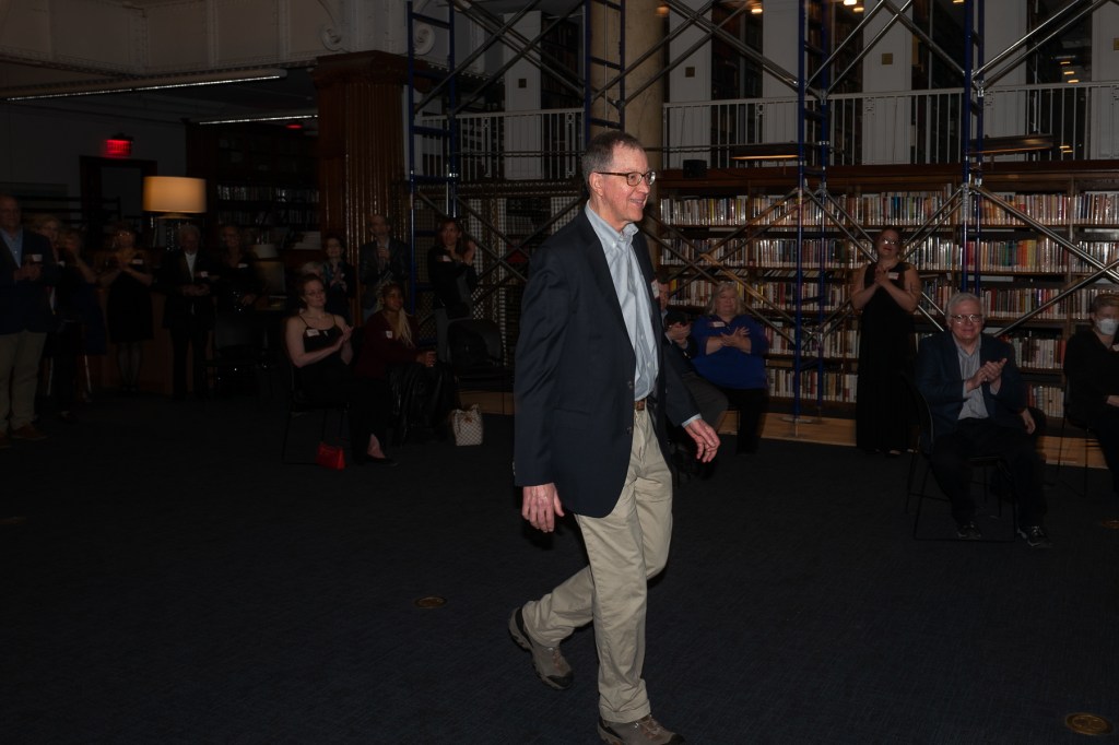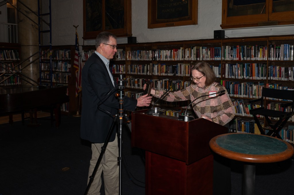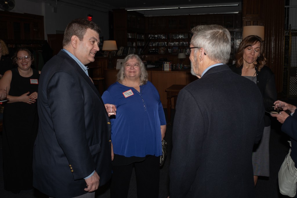 It’s my pleasure this week to herald the return of our photo gallery of events surrounding the Edgar Allan Poe Awards in New York City and the Malice Domestic convention in Bethesda, Maryland! The festivities all kicked off for the Dell Mystery Magazines with our pre-Edgars party, at which it’s been our custom for many years to present the EQMM Readers Awards. The Readers Awards presentation had to be done virtually in 2020 and 2021. In 2022, we held an in-person gathering, but it was a scaled-down celebration, with few guests attending from out of town and only two of the year’s four Readers Award winners present. As you’ll see from the photos below, last week’s party filled the house (which was, as in several previous years, the library of the General Society of Mechanics and Tradesmen, on 44th Street in Manhattan). Attendees included third-place Readers Award winner Anna Scotti, who flew in from California to receive her scroll for “Schrödinger, Cat” (EQMM March/April 2022); Doug Allyn, whom we hadn’t seen since our 2019 pre-Edgars party, who took second-place honors for “Blind Baseball” (EQMM May/June 2022); and W. Edward Blain, who captured readers’ votes with his pandemic-inspired story “The Secret Sharer” (EQMM July/August 2022), which took first place from a field of more than a hundred stories published in the magazine in 2022.