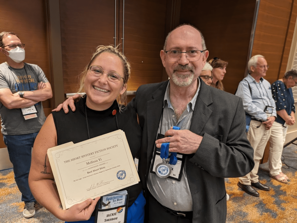During Thursday night’s opening ceremonies, Steve Steinbock (author, translator, and EQMM The Jury Box book reviewer) and I accepted the Short Mystery Fiction Society’s Derringer award on behalf of Melissa Yi (who won in the Short Story category for “My Two-Legs,” which appeared in AHMM). Martin Edwards (historian and author) was honored with the Edward D. Hoch Memorial Golden Derringer for Lifetime Achievement; later in the weekend, he won the Anthony Award for Best Nonfiction for his book The Life of Crime: Detecting the History of Mysteries and Their Creators. We’re proud to say that Martin’s first work of fiction appeared in EQMM’s Department of First Stories!